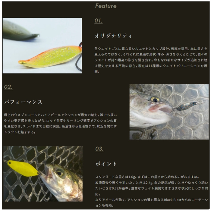 【ヴァルケイン/ValkeIN】時代を越える定番、釣果を生むハイアピール。ルアークリエイター菊地栄一が手がけた2作目にして代名詞的スプーン。長年にわたり多くのアングラーに愛され続けてきたその存在は、極上のウォブンロールと魚を寄せるハイアピールアクションに裏打ちされている。巻き速度やロッドの角度など、使い手次第で自在に変化するアクションがトラウトの本能を刺激し、確かなバイトへと繋げる。そして今もなお新しいウエイトが開発され進化を続ける、時代を越える定番。[HI BURST]
