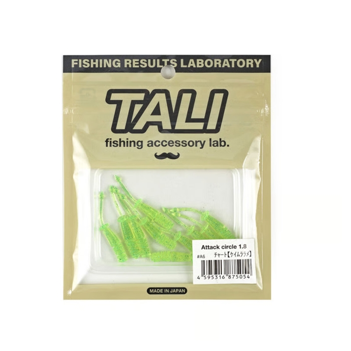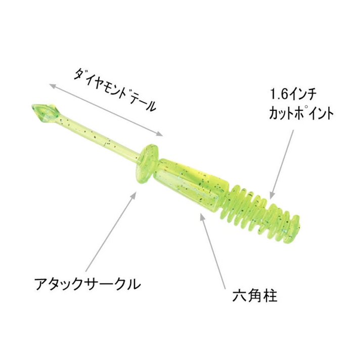 【タリ/TALI】あたりが手元に伝わりやすいアタックサークルを使用。1.8インチながら存在感のあるボディで豆アジ、デカアジの両方に対応!明確にあたりが手元に伝わるよう設計!極力引き抵抗を付ける為、深めのリブ、センター付近にある薄い円盤(アタックサークル)を採用。少しの水流でも、微波動するように、テール先端を8面体にカット(ダイヤモンドテール)しました。本体中盤の六角柱の形状によるフラッシング効果も期待出来ます。深リブ部分にカットマークが入っており、1.6インチにカットしても水平バランスを保ちます。リグの操作感、バイトの多さを体感できるワームとなっております!