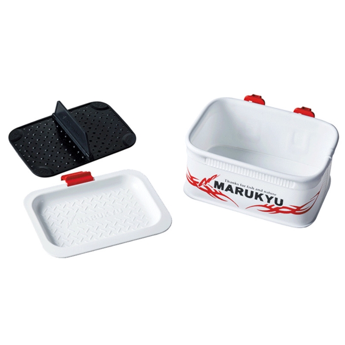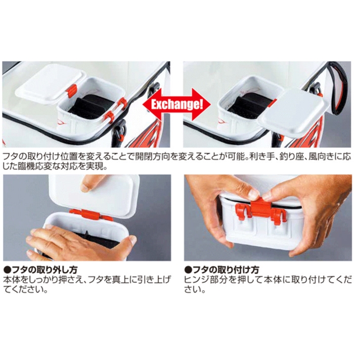 【マルキユー/マルキュー】フタの開閉方向が選べる新機構エサバケット。バッカンにセットして使用できる付けエサ用ケースです。フタと本体は新機構のオリジナルパーツにより、着脱が可能です。取り付け位置を変えることで、開く方向を入れ換えることができるようになりました。利き手、釣り座、風向きに応じた臨機応変な対応が可能です。フタは、風にあおられにくい適度な重さで、凹み部分にエサを乗せてもこぼれません。スノコは、本体にピッタリと収まっているので不意の落下が軽減されています。スノコを取り出す際は、四隅の[PUSH]を1ヶ所押すと反対側が持ちあがる仕組みです。大きさは、仕切り無しの状態で弊社ダブルパックオキアミの片方がちょうど収まるワイド145mmサイズです。その他には、バッカンの内側にセットしたままファスナーが閉められるショートフックや、本体が前下がりになるのを防ぐ独自のフィンも装備されています。※他メーカーのバッカン使用の場合、ファスナーが閉まらない場合があります。
