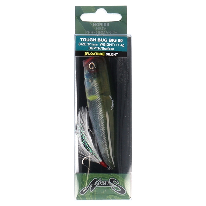 【ノリーズ/NORIES】バスが常にハイプレッシャーに晒されているトーナメントレイクやメジャーレイク。そんな場所でも意外と口を使わせやすいステージが「水面」。「タフバグ」はそのステージを最大限に活用する「タフタイムポッパー」として誕生。高精度でキャストしやすいベイトキャスティングタックルで扱えるウエイトで、着水音を抑えたピンスポットキャストが可能。それでいてバスを驚かすことのない適度なボリューム感。テールを沈めた浮き姿勢から移動距離を抑えてドッグウォークできるピンスポット攻略バランスと、ダイブを織り交ぜた派手すぎないナチュラルポップ音&スプラッシュ。タフタイムのスレきったビッグバスも思わずバイトしてしまう食わせ系ポッパーです。「ビッグ80」はより強いタックルでも扱えるサイズで、カバー攻めのダブルフックチューニングにも対応するアイマウントも装備。よりカバー奥への攻め込みが可能に。もちろんロングキャスト性も向上しています。