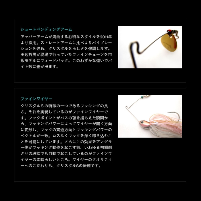 【ノリーズ/NORIES】釣れるスピナーベイトの名を不動のものとしたオリジナル「クリスタルS」『V』ブレードのアクションをロスなくヘッドへ伝えるファインワイヤーと、ナチュラルウェーブするプロファインスカートの組み合わせで強力なバイブレーションを生み出し、トータルバランスでバスにアピール。フックサイズもウェイト別に使うタックルを想定したベストサイズを装備。ファインワイヤーがもたらす直線効果との相乗による抜群のフッキング率は、使うプロ達が口を揃えて語る特長です。究極の域まで完成度を高めた、ノリーズが誇る自信のスピナーベイトです。2011年より、ショートベンディングアームを採用し、さらにアピールを強めた仕様となります。[CRYSTAL S]