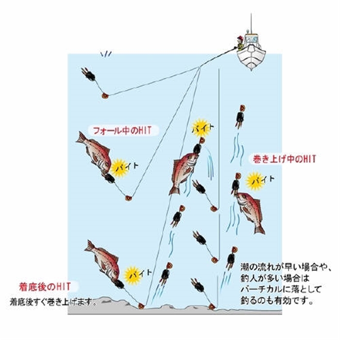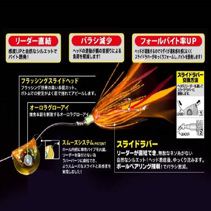 ヘッドが遊動するのでマダイが違和感を感じにくくスライドラバーがゆっくりフォールし、バイトを誘発します!ヘッドの遊動が鯛の首振りによる負荷を軽減します!感度UPと自然なシルエットでバイト誘発!