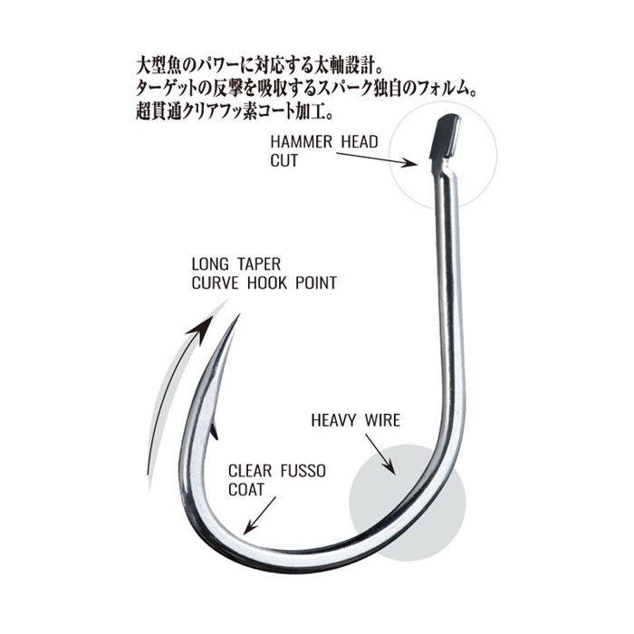 【ささめ針/SASAME】超貫通性能はそのままに、防錆性能を強化。対大型魚設計「ヘビースパーク」。大型魚のパワーに対応する太軸設計。ターゲットの反撃を吸収するスパーク独自のフォルム。超貫通クリアフッ素コート加工。人気の「スパーク」フックを強度、貫通性能、防錆性能において強化。ヒラマサ、カンパチ、マグロなどのパワーファイターに対応する太軸設計。新採用の「クリアフッ素コート」は、TCフッ素コートに匹敵する摩擦係数で抜群の貫通性能を発揮する。加えて、高い防錆性能を併せ持った特殊コーティング。死角無しの鉄壁ジギングフックの理想形、それが「ヘビースパーク」だ。