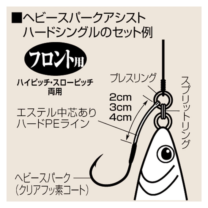 【ささめ針/SASAME】クリアフッ素コートフック&中芯ありPEラインの太軸超貫通シングルアシスト。超貫通クリアフッ素加工ベビースパークフックのシングルタイプ。ハイピッチでもスローピッチでもフロント用として使用可能。エステルの中芯が入ったハードタイプでフロントフックに最適。中芯がエステルラインなので折りグセが付いても引っ張れば元に戻る。高強度太軸フックなのでマグロ、カンパチ、ヒラマサ、ブリなどのパワーファイターに太いメインラインと高ドラグテンションで挑める。様々なジグ、状況に対応する2cm、3cm、4cmの3タイプ、5フックサイズをラインナップ。