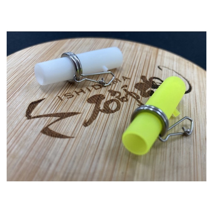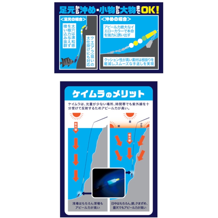 【キザクラ/KIZAKURA】穴径が5.8mmの大きいホールは、太い道糸、瀬ズレワイヤーもスムーズに通るため、違和感を極力与えず、喰い込み抜群。太径のため、クエ(アラ)狙いの太仕掛けにも対応。クッション性の高い素材は根掛かりを軽減し、スムーズな手返しを実現。カラーはイエローとケイムラブルーの2色。イエローは石物が興味を持つカラー。ケイムラブルーは紫外線を受けて発光するため、特に深場やまずめ時に威力を発揮。