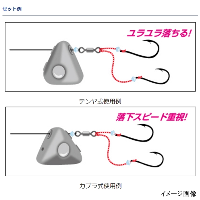 テンヤにもカブラにもなる遊動テンヤ。ヘッドに設けられた2つの穴への通し方を変えることで、ボトムが平らなテンヤ型にしてユラユラ落とすか、水切れが良いシャープなカブラ型でストレートに早く沈めるかの2通りの切り替えが可能。潮や魚の食い状況によって使い分けることで1つのヘッドで多彩なアクションを演出することができる。遊動式のためエサに食いついた魚に違和感を与えにくく、マダイの首振りにも追従してバラシを防ぐ。驚異の貫通力「SaqSas」フック搭載でフッキング性能も秀逸。糸の摩擦を軽減するパイプ付き。潮が速い時やタナが深い時には「紅牙テンヤカブラプラスシンカー」(別売)でウエイトアップ可能。[KOHGA YUDO TENYA + SS]