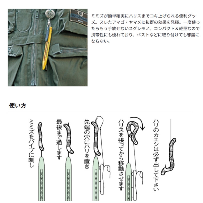 郡上の川漁師が生んだ秘伝ミミズ通し!これは便利!ミミズが簡単確実にハリスまでコキ上げられます。スレたアマゴ・ヤマメに抜群の効果。一度使ったら、もう手放せないスグレモノ。もちろん、携帯性も備えています。