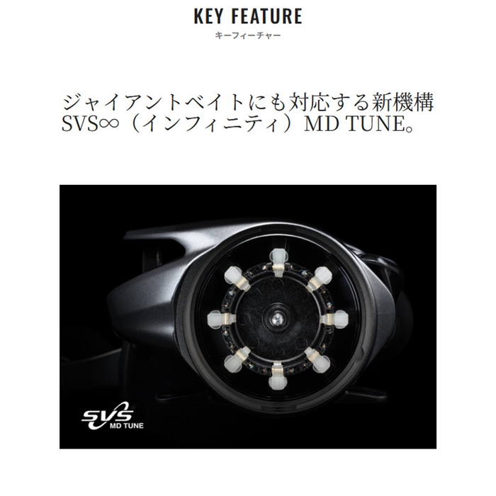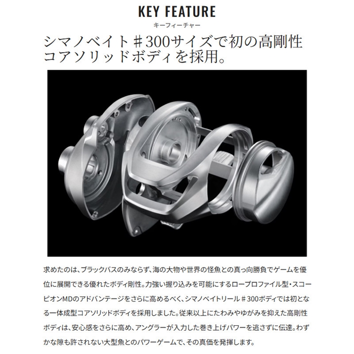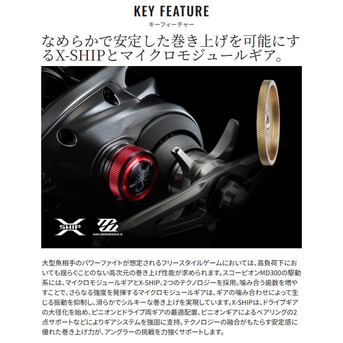 ブラックバスから青物、怪魚まで、数々の大物と対峙してきたスコーピオンMDが、さらに強く、扱いやすく進化しました。NEWスコーピオンMD300は、#300サイズ初のコアソリッドボディを採用しています。従来以上にたわみを抑えた高剛性ボディは、巻き上げパワーの伝達力を高め、大型魚との真っ向勝負に大きなアドバンテージをもたらします。ブレーキシステムには、新機構SVSインフィニティMD TUNEを採用。外部ダイアルによる無段階調整はもちろん、8個のブレーキシューにより高いブレーキ力が確保され、空気抵抗の大きいジャイアントベイトや、急な風向きの変化への対応力も向上しています。マイクロモジュールギアやX-SHIPといった基本機能を踏襲し、ハイラインキャパシティや高いドラグ力で鍛え上げた生粋のフリースタイル仕様。さらなる大型魚に挑むための、本気のウルトラストロングモデルです。[SCORPION MD][24new02]