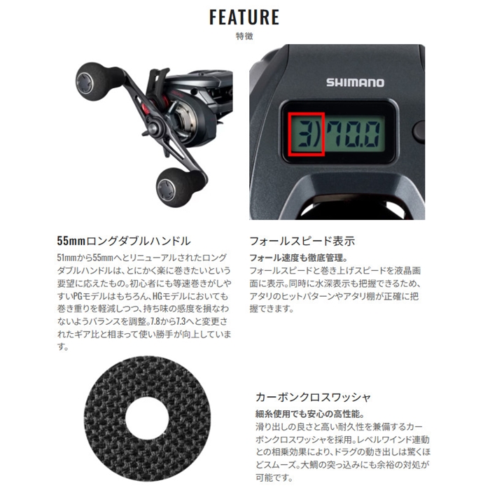 軽量・ロープロファイルのコンパクトボディに先進の機能を惜しげもなく搭載。NEWエンゲツCTは、フォールレバーやデジタルカウンターといった高性能を手ごろな価格帯に凝縮したコストパフォーマンスが魅力。中上級者はもちろん、これから始める初級者にも鯛ラバゲームの醍醐味を存分に体感できる一台に仕上がっています。前作からの進化点は、ブレーキをかけてもハンドル回転が重くならない新型フォールレバーや、巻上距離アラーム機能が付いていっそう使いやすくなったインカウンターの搭載。さらにハンドルは51mmから55mmへとロング化して巻き上げの負担を軽減しつつ、巻き感度も両立。アップデートを行いながら、総重量は前作より約20g軽量化。ラインナップはHG、PGにそれぞれ右ハンドルと左ハンドルを展開。幅広いシチュエーションに対応可能な盤石のスペックで近海の鯛ラバゲームをフルカバーします。[ENGETSU CT][25new02]