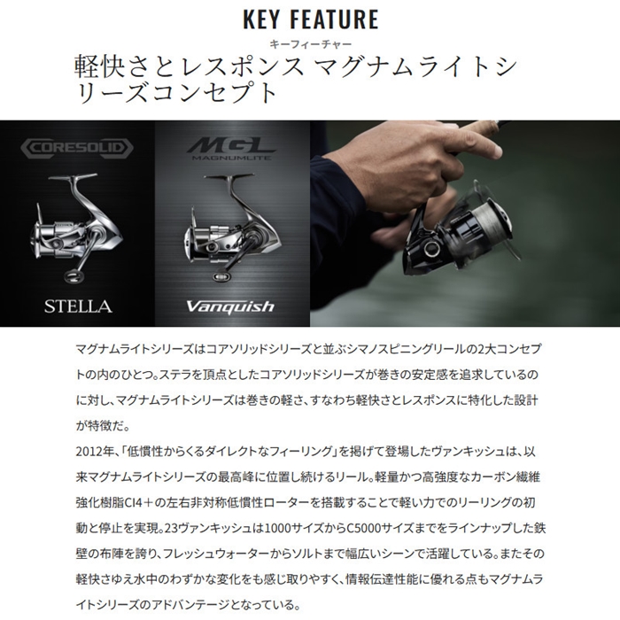 マグナムライトシリーズのフラッグシップモデルとしてテクニカルなゲームを支えてきたヴァンキッシュに、26年限定のCEモデルが新登場。見つめる先は23ヴァンキッシュとは異なる特別な領域。COMPETITION EDITIONの名が示す通り、エリアトラウトやバスのトーナメンターなど己のポテンシャルを最大限に引き出すスペックを突き詰めた。開発のコンセプトは圧倒的な「巻き感度」。23ヴァンキッシュに備わっていた防水性能の一部を削ぎ落してまで回転トルクの低減にこだわり、感度とレスポンスを徹底的に磨いた巻きの軽さはまさに異次元。リールの存在を忘れるほどダイレクトな操作感と情報伝達力は快感と感動を呼び覚ますだろう。ラインナップは1000から2500サイズまでの8アイテム。インフィニティクロス、インフィニティドライブなどのコアテクノロジーは23ヴァンキッシュを踏襲しつつ、巻き感度に徹底的に拘ったスペックでトーナメンターやコアアングラーをサポートする。[VANQUISH CE][26new02]
