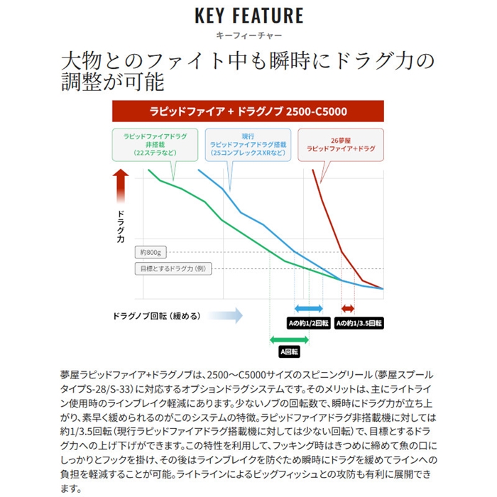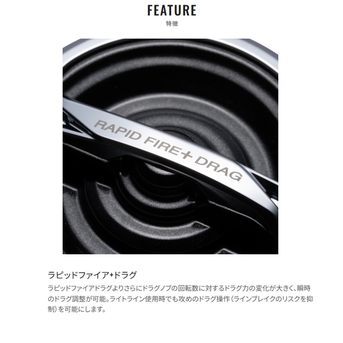 ドラグノブの回転数に対する調整幅を大きく設定することで、瞬時のドラグ調整が可能。ラインブレイクのリスクを軽減します。従来のラピッドファイアドラグより、さらにドラグ力の変化が大きく、ライトライン使用時でも攻めのドラグ操作を可能にします。[YUMEYA RAPID FIRE+ DRAG KNOB][26new02]