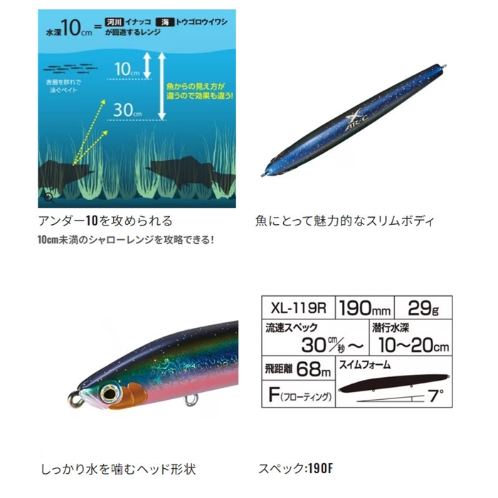 COOは水深10cmのレンジを狙って開発された、水面直下特化型ルアー。シンペンの様な泳ぎなのに、フローティングで浮く。だから、シーバスが下からしっかりルアーを見上げて認識します。シーバスがCOOを見て、エサとして認識し、そして喰いに来る。そのチャンスを増やすためには、まず見せることが最も重要。バチ、ボラ、コノシロ、サヨリにハタハタまで。このサイズだからこそ開ける新たな世界を体感してください。[EXSENCE COO]