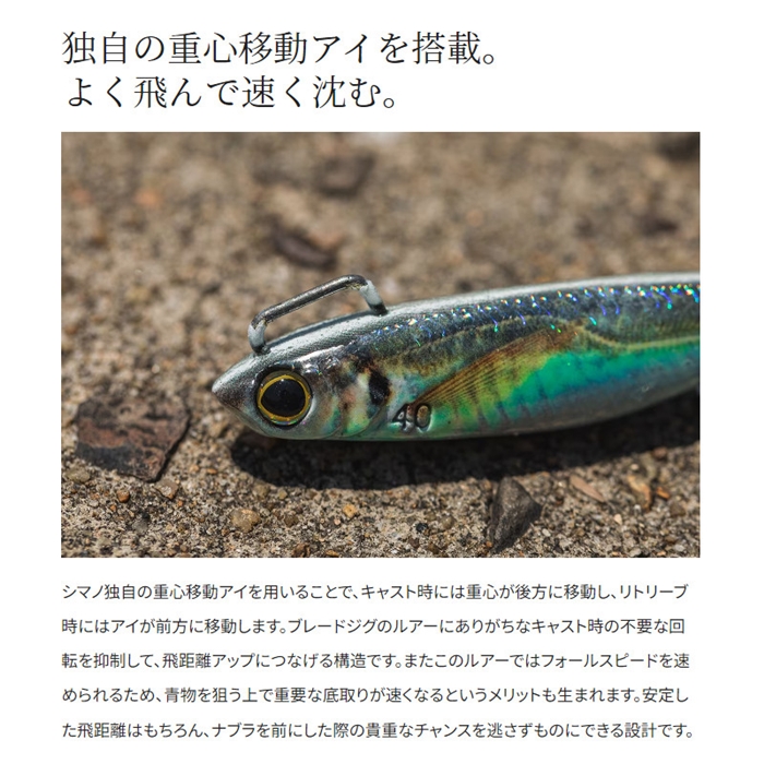 「コルトスナイパー アオモノブレード」は、青物用に開発したブレードジグ。シンプルな構造と使いやすさを目指して設計しました。不必要にボディが回転しないようにこだわることで、アクションやフォール時の姿勢が安定する設計。またスナップを付けるアイの部分をシマノ独自の構造にすることで、飛距離アップとトラブルレス性能を両立しています。特に防波堤から青物を狙うようなシチュエーションを想定して設計されており、誰でも気軽に青物を狙って楽しめるような使いやすさにこだわりました。[COLTSNIPER][23new16]