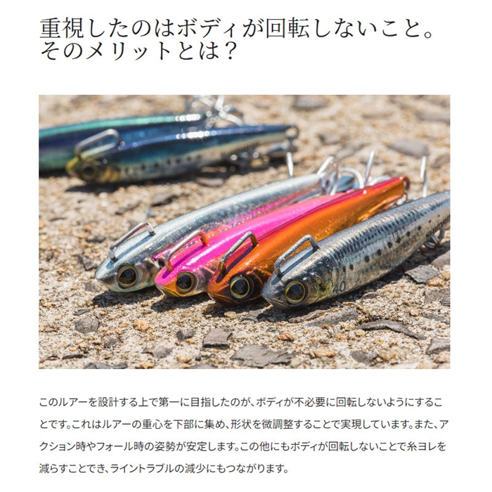 「コルトスナイパー アオモノブレード」は、青物用に開発したブレードジグ。シンプルな構造と使いやすさを目指して設計しました。不必要にボディが回転しないようにこだわることで、アクションやフォール時の姿勢が安定する設計。またスナップを付けるアイの部分をシマノ独自の構造にすることで、飛距離アップとトラブルレス性能を両立しています。特に防波堤から青物を狙うようなシチュエーションを想定して設計されており、誰でも気軽に青物を狙って楽しめるような使いやすさにこだわりました。[COLTSNIPER][23new16]