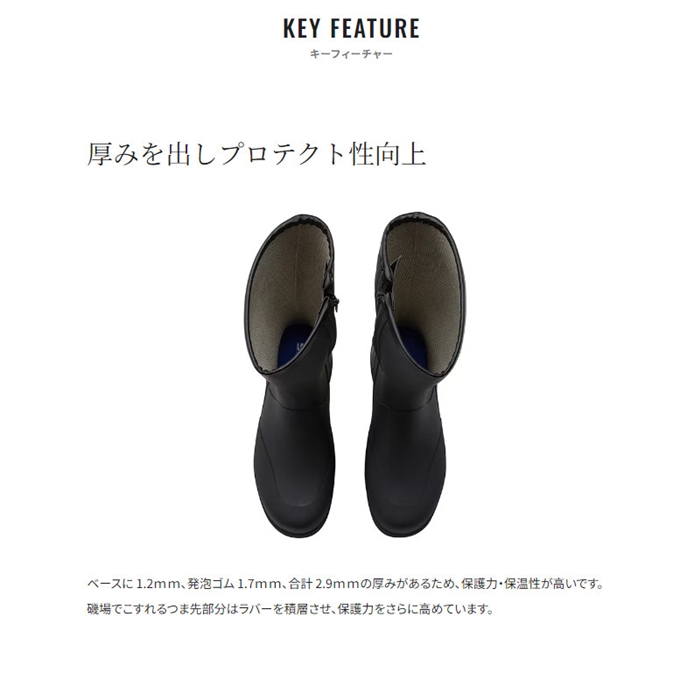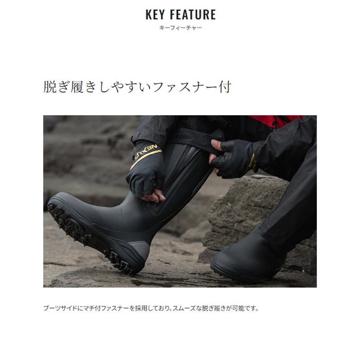 ベース1.2mmに発泡ゴム1.7mmを使用しているのでほどよい重さながらも、プロテクト性・保温性に優れています。足の指部分はラバーを積層して、さらにプロテクト性を高めました。サイドにはマチ付のファスナーを配置しているので、スムーズに脱ぎ履きができます。ソールは岩にがっちり食い込むスパイクソールです。[24new04]