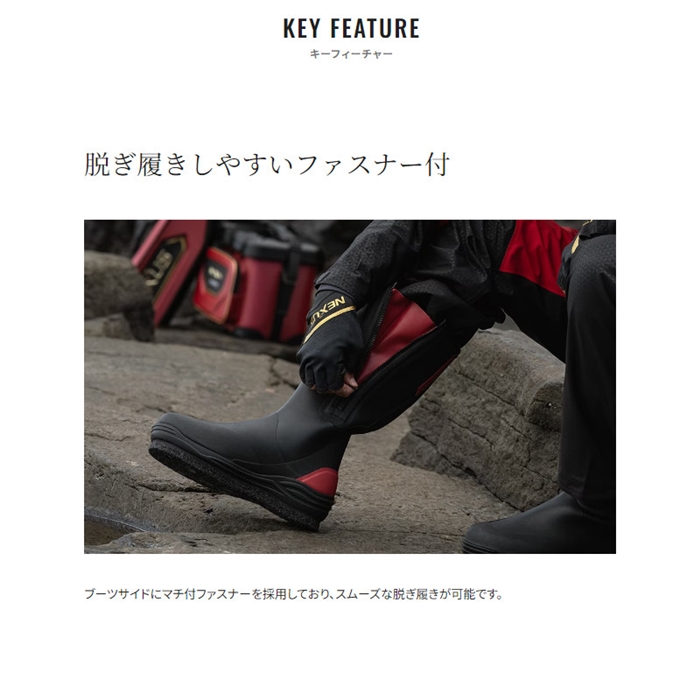 ベース1.2mmに発泡ゴム1.7mmを使用しているのでほどよい重さながらも、プロテクト性・保温性に優れています。足の指部分はラバーを積層して、さらにプロテクト性を高めました。サイドにはマチ付のファスナーを配置しているので、スムーズに脱ぎ履きができます。ソールはカットラバーピンフェルトで磯や渡船のFRPでも、しっかりとサポートしてくれます。[24new04]