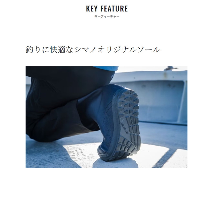 船釣り、特にエサを使用したシーンを考慮したデッキブーツで、特徴はシマノオリジナルのソールパターンにあります。高いグリップ力に加え、テーパー状に工夫されたパターンはソールの溝にエサなどが挟まっても取れやすくメンテナンス性にも優れています。また全数防水チェックを行ったラバー製品なので防水に関しては優れた性能を持っています。ブーツ丈はレインパンツの裾が足入れ口を覆ってくれる適度な短さに設定されています。[24new04]