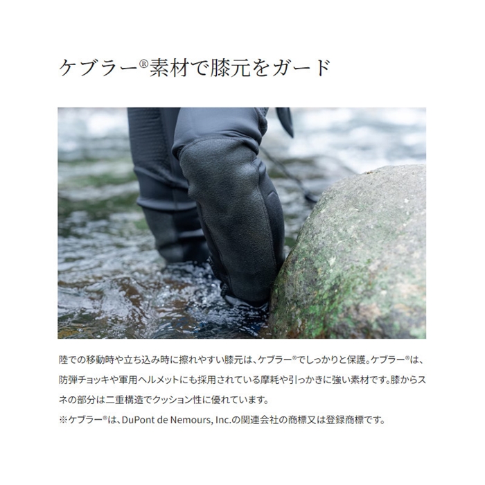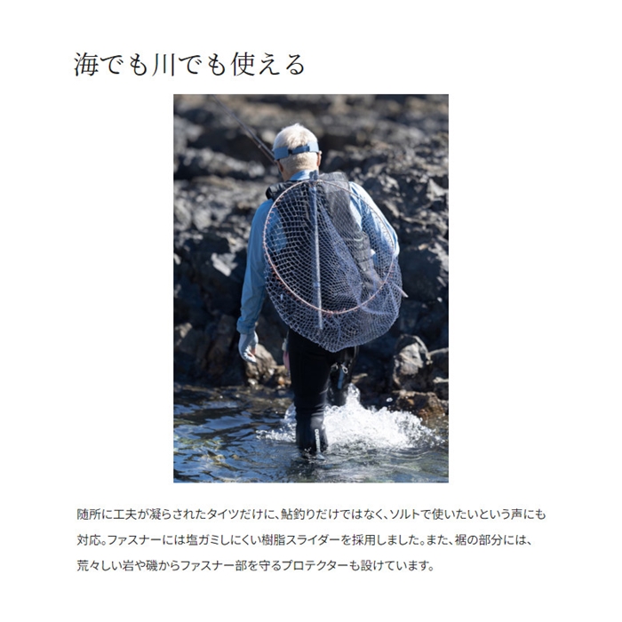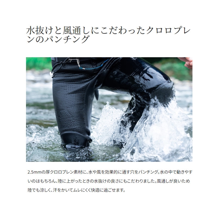 真夏の川を楽しく激しく遊べるようにと、快適な涼しさを追求して適所に穴を開けたパンチングクロロプレン2.5mm厚を採用したタイツです。丈も腰上までとすることで涼しさアップ。激しく動いてもタイツがずれないようサスペンダーでサポートしています。擦れる膝下部分は耐摩耗性の高いケブラーで補強。2.5mm厚のクロロプレンとも相まって、足元をしっかりガードします。ファスナーは樹脂製を採用するなど、川でも海でも活躍できるニュータイプのタイツです。[鮎ゲーム][24new04]