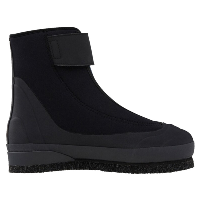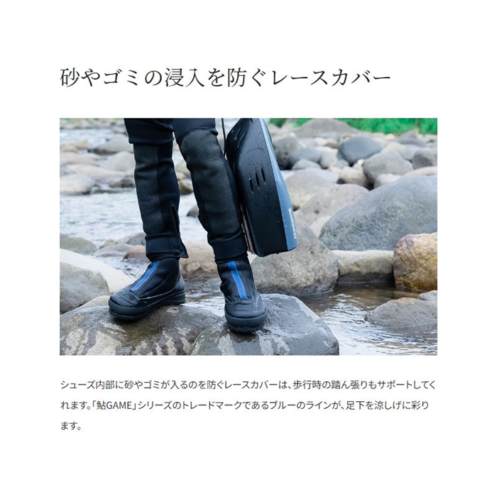 真夏の川をとことん楽しむ「鮎GAME」シリーズのシューズです。新たに鮎釣りを始められる方にも使いやすいよう形状は中丸タイプにしました。水中の見えない石を足裏でしっかりと感じてもらえるようにソールは直付けしています。本体は5.0mm厚クロロプレンを採用しているので足あたりはソフトですが、耐摩耗性を高めるために外側のベースにラバーを採用。さらに爪先などの石が当たりやすい部分は積層ラバーでしっかりガードしています。脱ぎ履きしやすいようクイックシューレースとフロントファスナーを採用し、レースカバーで覆うことでゴミや砂の侵入を防止。すっきりとした外観と機能性を追求したシューズです。[鮎ゲーム][24new04]