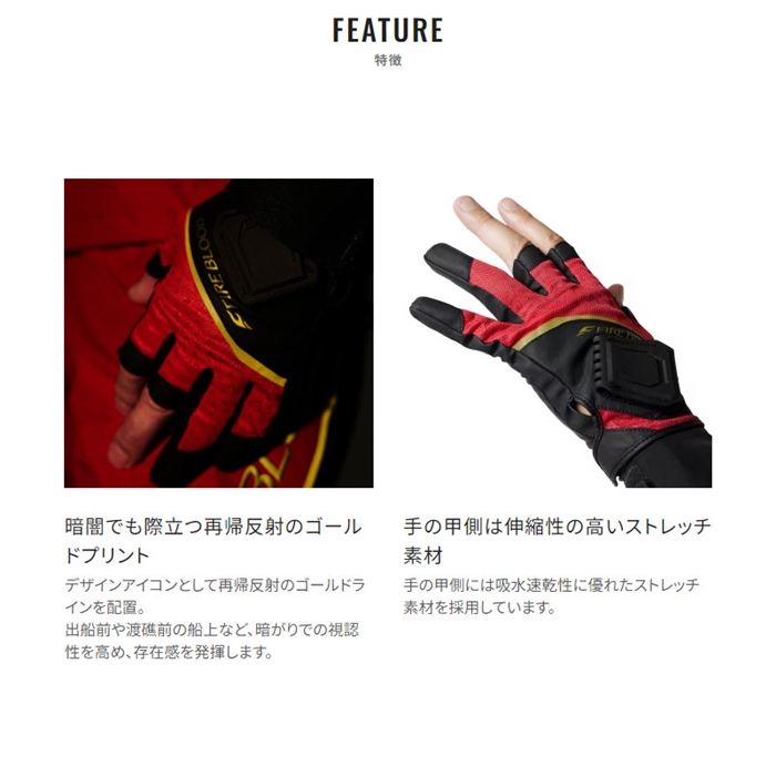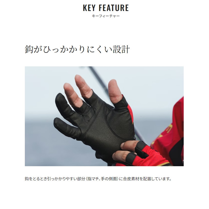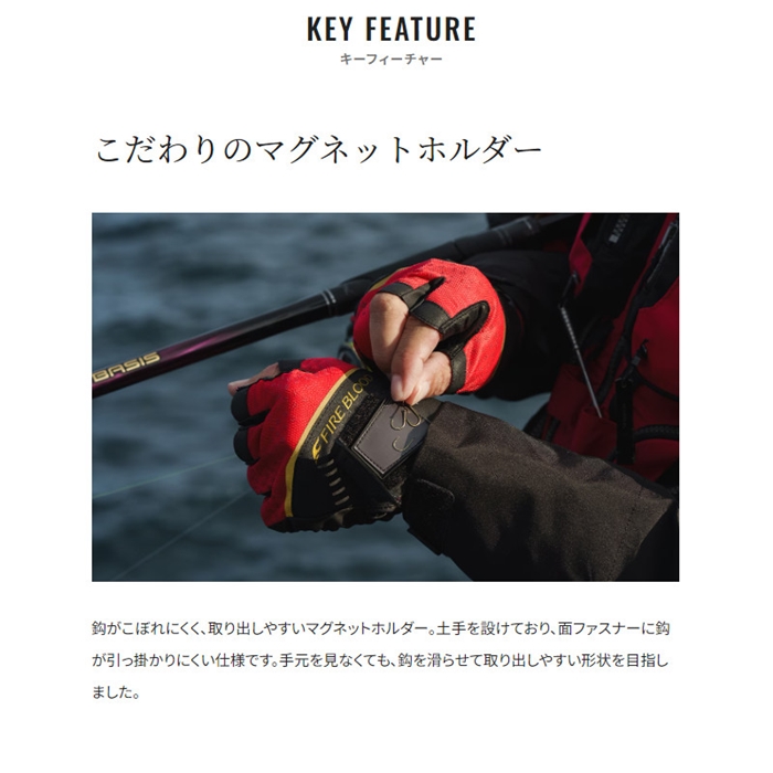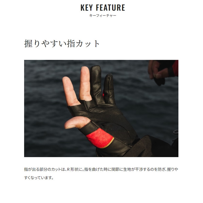 厳しい磯場で釣りに集中できるよう、鈎をつかむ、交換する、ロッドやヒシャクを振る、一連の流れでの使いやすさにこだわったリミテッドプログローブ。吸水速乾ストレッチ生地を甲側に配置することで、暑い時期から肌寒い秋まで幅広いシーズンに対応しています。