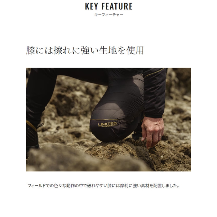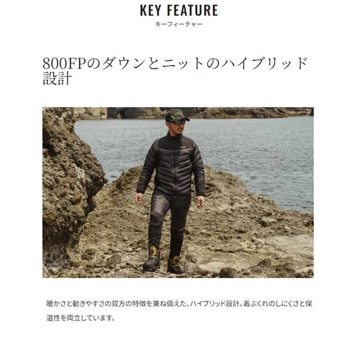 ダウンとストレッチニットのハイブリッド設計により、ミドラーとして使用する際にも着ぶくれしにくい薄さと、保温性を両立したスーツ。一部にストレッチニットを採用し、シューズ・ブーツと合わせても動きを妨げにくいのが特徴です。また、裏地の蓄熱保温素材は冬の過酷な釣行時において、体温を効果的にキープするのに役立ちます。[24new04]