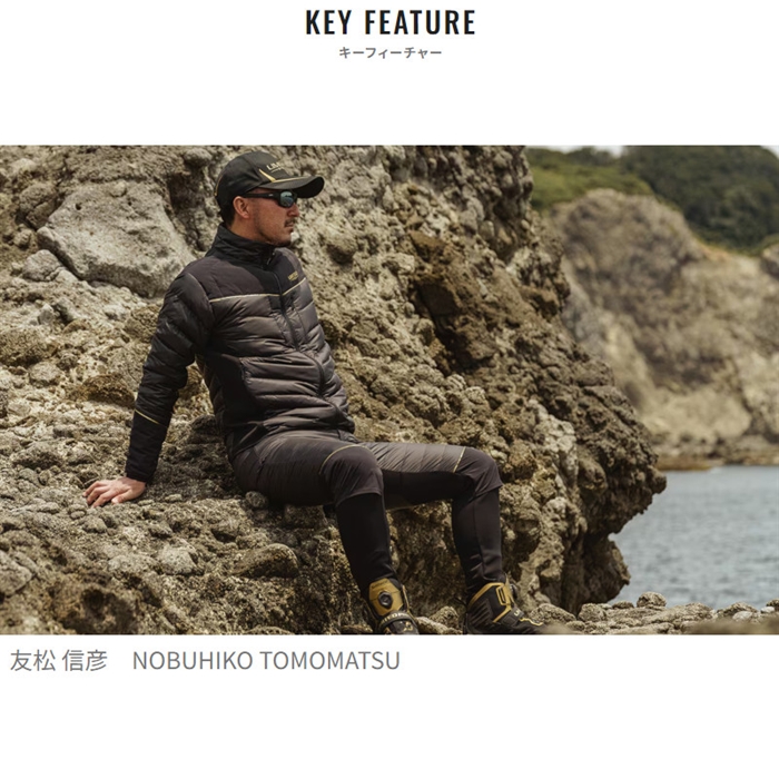 ダウンとストレッチニットのハイブリッド設計により、ミドラーとして使用する際にも着ぶくれしにくい薄さと、保温性を両立したスーツ。一部にストレッチニットを採用し、シューズ・ブーツと合わせても動きを妨げにくいのが特徴です。また、裏地の蓄熱保温素材は冬の過酷な釣行時において、体温を効果的にキープするのに役立ちます。[24new04]