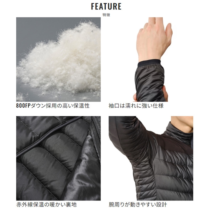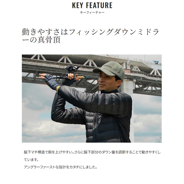 ミドルレイヤードに必要とされる保温性と軽量性を追求したフィッシング用ダウンミドラー。800FP高品質ダウンを使用し、裏地には蓄熱素材を使用した高い保温性とコンパクトにたたんでしまえる収納性が特徴。袖周りは濡れても保温性が落ちにくい化繊中綿を使用し、腕まくりしやすいゴムシャーリングの袖口で水回りで使用しても濡れにくい、アングラーの使いやすさこだわった仕様になっています。[24new04]