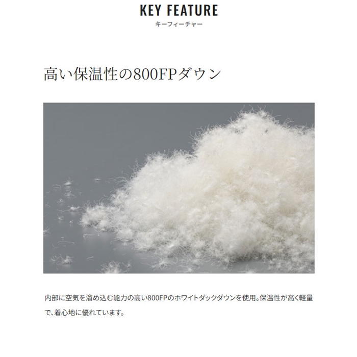 【素材】 [表]ポリエステル100% [中綿]ダウン95%、フェザー5% [裏]ポリエステル100%/ナイロン100% [部分]ナイロン88%、ポリウレタン12%/ポリエステル100%