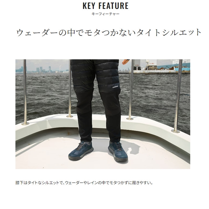 軽くて暖かいダウンと動きやすいストレッチ素材のハイブリッドパンツ。ミドルレイヤードに必要とされる保温性と軽量性を追求したフィッシング用ダウンミドラー。暖かさが必要なお尻・太ももには800FP高品質ダウン、股下・膝下には動きやすいストレッチ素材のハイブリッド設計。さらに膝をつくことが多い釣りの動作の中で、膝には耐摩耗性の高い素材を使用し、アングラーの使いやすさこだわった仕様になっています。[24new04]