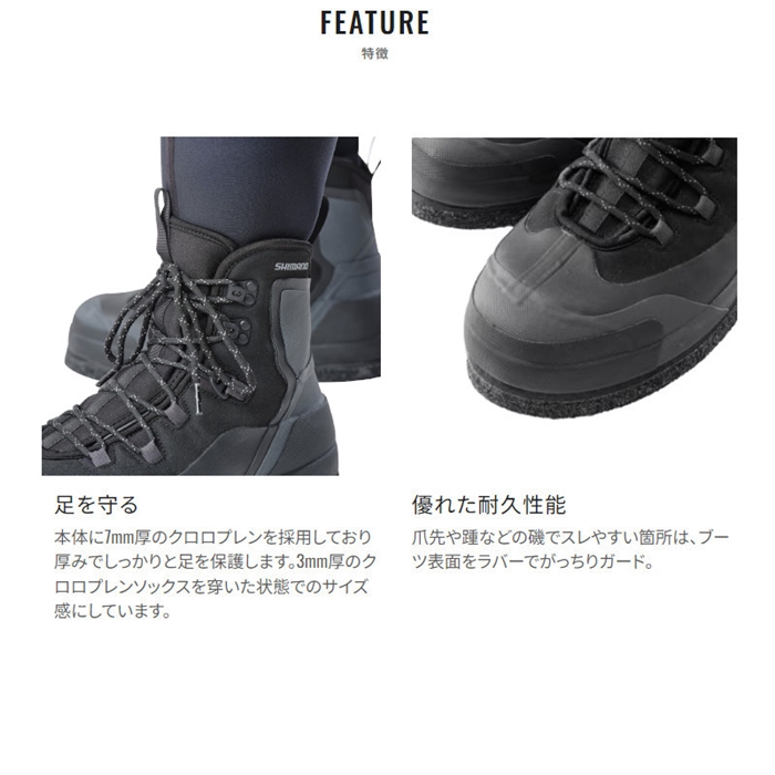 耐久性と保護性を突き詰めた排水機能付きブーツ。足をしっかりガードできるように設計されたロックショアブーツ。アッパーには7mm厚のクロロプレンを採用。更に爪先や踵の最外層はラバーでしっかりと保護。ソールは磯での評価の高いカットラバーピンフェルトで、広めに設計された底面積が安定感をサポートします。フィット感は3mm厚のソックスを穿いた状態を想定したサイジング。サイズ展開も25cmから29cmと0.5cm刻みで幅広く展開しています。[24new04]