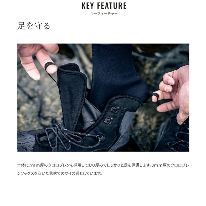 耐久性と保護性を突き詰めた排水機能付きブーツ。足をしっかりガードできるように設計されたロックショアブーツ。アッパーには7mm厚のクロロプレンを採用。更に爪先や踵の最外層はラバーでしっかりと保護。ソールは磯での評価の高いカットラバーピンフェルトで、広めに設計された底面積が安定感をサポートします。フィット感は3mm厚のソックスを穿いた状態を想定したサイジング。サイズ展開も25cmから29cmと0.5cm刻みで幅広く展開しています。[24new04]
