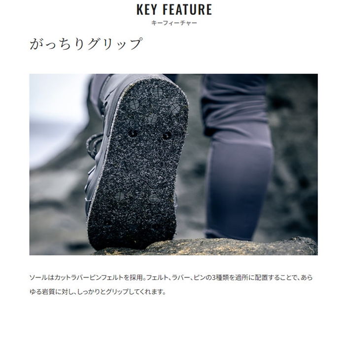 耐久性と保護性を突き詰めた排水機能付きブーツ。足をしっかりガードできるように設計されたロックショアブーツ。アッパーには7mm厚のクロロプレンを採用。更に爪先や踵の最外層はラバーでしっかりと保護。ソールは磯での評価の高いカットラバーピンフェルトで、広めに設計された底面積が安定感をサポートします。フィット感は3mm厚のソックスを穿いた状態を想定したサイジング。サイズ展開も25cmから29cmと0.5cm刻みで幅広く展開しています。[24new04]