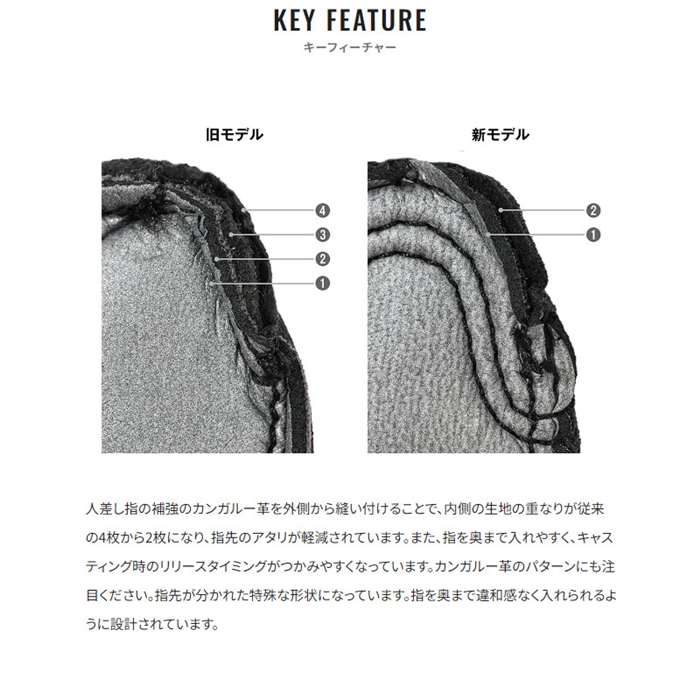 人差し指部分にカンガルー革を採用、手のひらには衝撃緩和パッド入れるなど、過酷なオフショアゲームや遠征での使用にも耐えうる冬用グローブです。人差し指部分のキャスティングガードの縫い代を外側にする特殊設計により指が奥まで心地よくフィット。キャスティング時のリリースポイントが把握しやすくなります。親指にも補強レザーを配置しジギングゲームにも対応。ノット締め込み時などに負荷のかかる親指、手の甲小指側のレザー設計にもこだわった、スキのない一品となっています。[24new04]