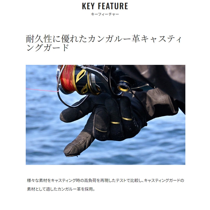 人差し指部分にカンガルー革を採用、手のひらには衝撃緩和パッド入れるなど、過酷なオフショアゲームや遠征での使用にも耐えうる冬用グローブです。人差し指部分のキャスティングガードの縫い代を外側にする特殊設計により指が奥まで心地よくフィット。キャスティング時のリリースポイントが把握しやすくなります。親指にも補強レザーを配置しジギングゲームにも対応。ノット締め込み時などに負荷のかかる親指、手の甲小指側のレザー設計にもこだわった、スキのない一品となっています。[24new04]