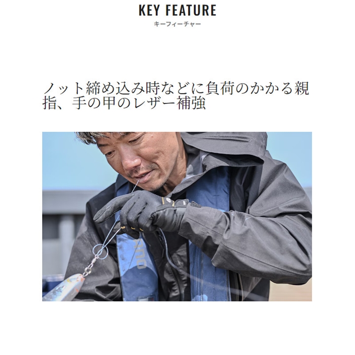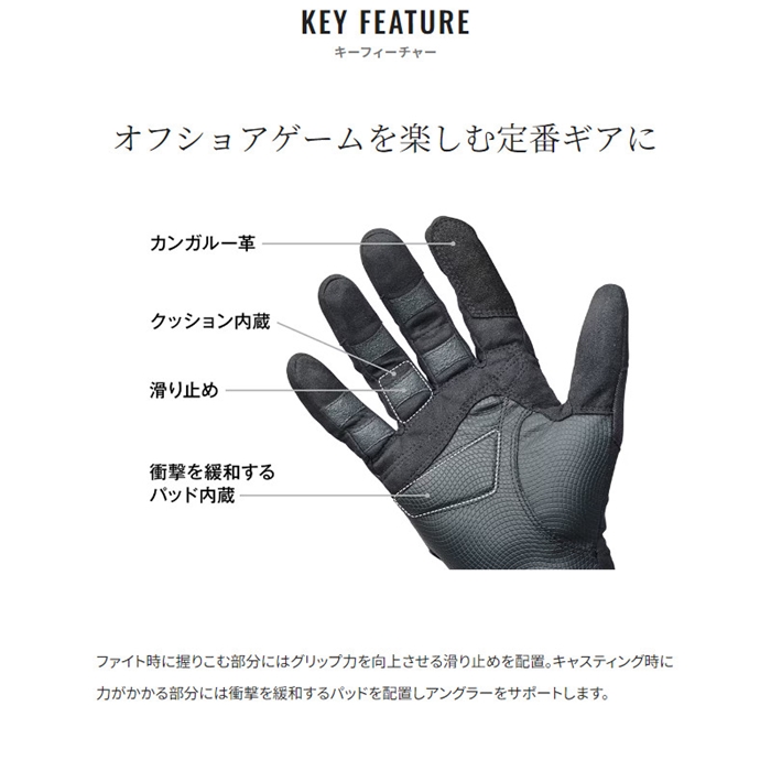 人差し指部分にカンガルー革を採用、手のひらには衝撃緩和パッド入れるなど、過酷なオフショアゲームや遠征での使用にも耐えうる冬用グローブです。人差し指部分のキャスティングガードの縫い代を外側にする特殊設計により指が奥まで心地よくフィット。キャスティング時のリリースポイントが把握しやすくなります。親指にも補強レザーを配置しジギングゲームにも対応。ノット締め込み時などに負荷のかかる親指、手の甲小指側のレザー設計にもこだわった、スキのない一品となっています。[24new04]