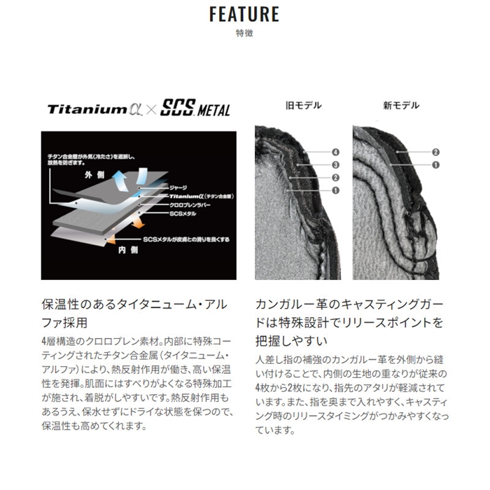人差し指部分にカンガルー革を採用、手のひらには衝撃緩和パッド入れるなど、過酷なオフショアゲームや遠征での使用にも耐えうる冬用グローブです。人差し指部分のキャスティングガードの縫い代を外側にする特殊設計により指が奥まで心地よくフィット。キャスティング時のリリースポイントが把握しやすくなります。親指にも補強レザーを配置しジギングゲームにも対応。ノット締め込み時などに負荷のかかる親指、手の甲小指側のレザー設計にもこだわった、スキのない一品となっています。[24new04]