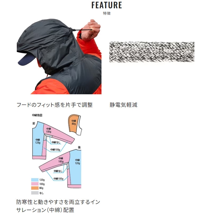 【素材】 ナイロン100%(ポリウレタン透湿防水加工) [中綿]ポリエステル100% [裏]ナイロン100% [部分]ポリエステル100%/ナイロン100%