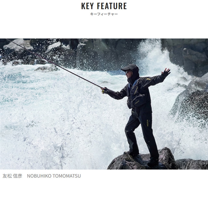 表地にゴアテックス、保温性を高める蓄熱裏地を採用した磯用テクノレイヤードスーツです。表生地をポリエステルからナイロンへ変更することで、耐久性の向上を目指しました。2重袖口、ベストとのコンビネーションシステム、あごに当たりにくい襟形状など、磯釣りで求められる基本性能と着ごこちに磨きをかけました。[24new04]