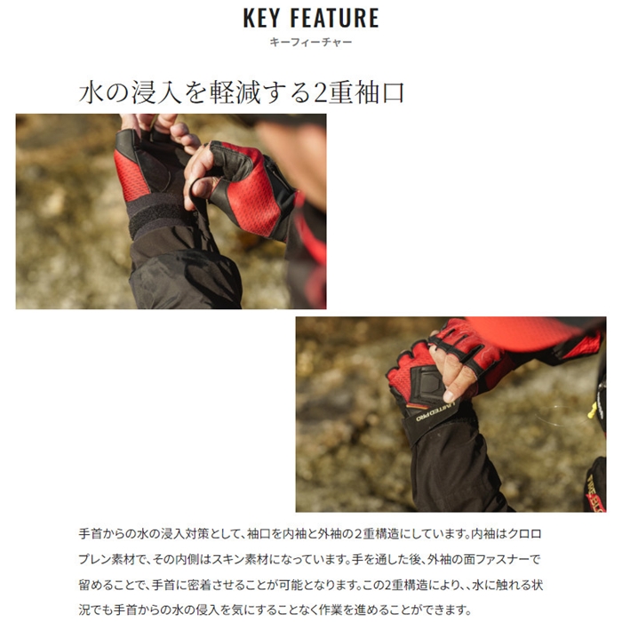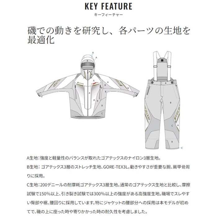ゴアテックスのストレッチを採用したフラグシップモデルのテクノレイヤードスーツです。アングラーの動きを分析し、動きやすさを追求した立体パターン設計を採用。保温性を高める蓄熱裏地に加え、ベストとのコンビネーションシステム、あごに当たりにくい襟形状、シューズ内への波の浸水を防ぐ2重裾、耐久性向上を目指した生地の厚さ変更など、前作の機能をブラッシュアップして完成度の更なる高みを目指しました。[24new04]