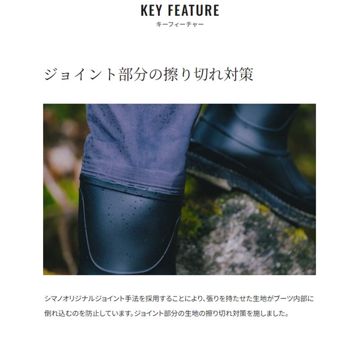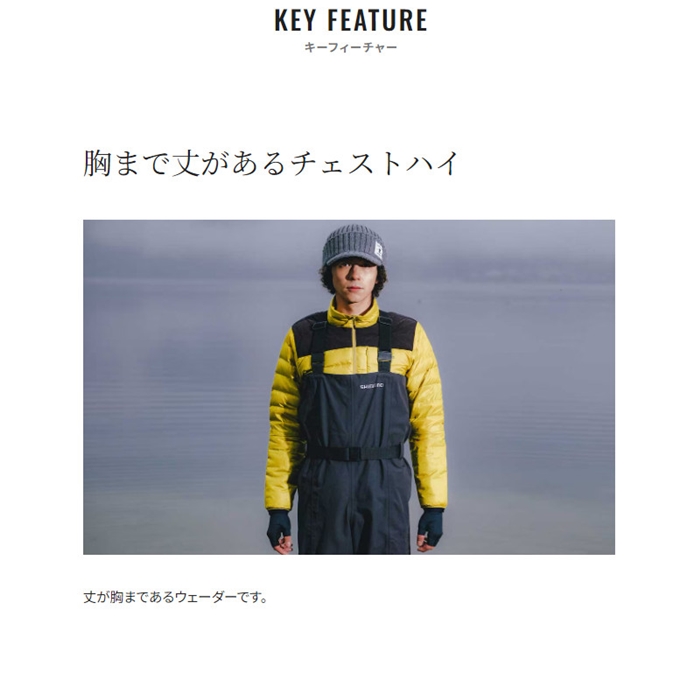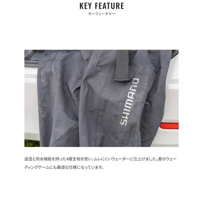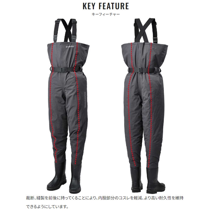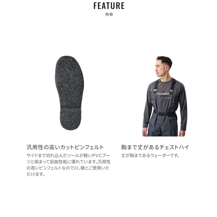 生地は透湿防水のドライシールド4層生地を採用。動いた際の湿度を外へ放出しするのでムレにくいです。また耐摩耗性も高いレベルを実現。ブーツはあえて軽く、屈曲性の高いPVCブーツを採用。胸までカバーするチェストハイモデル。ソールは河川や磯場でも滑りにくいカットピンフェルトソールを採用しています。[24new04]