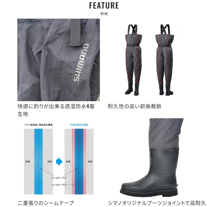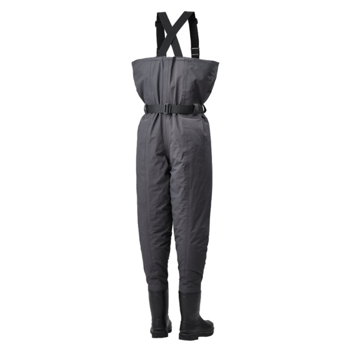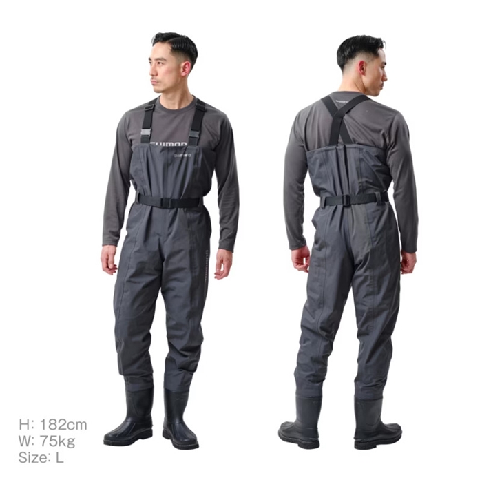 生地は透湿防水のドライシールド4層生地を採用。動いた際の湿度を外へ放出しするのでムレにくいです。また耐摩耗性も高いレベルを実現。ブーツはあえて軽く、屈曲性の高いPVCブーツを採用。胸までカバーするチェストハイモデル。ソールは河川や磯場でも滑りにくいカットピンフェルトソールを採用しています。[24new04]