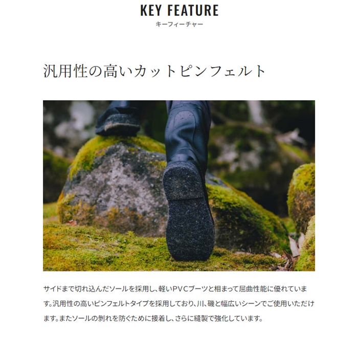 生地は透湿防水のドライシールド4層生地を採用。動いた際の湿度を外へ放出しするのでムレにくいです。また耐摩耗性も高いレベルを実現。ブーツはあえて軽く、屈曲性の高いPVCブーツを採用。胸までカバーするチェストハイモデル。ソールは河川や磯場でも滑りにくいカットピンフェルトソールを採用しています。[24new04]