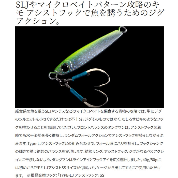 高比重タングステン素材の特性を活かし、ややフロントバランスの薄型フラットサイドボディを採用した「タングマン」。強い明滅を伴いランダムにアクションを変化させるすばやい水平バイブレーションフォールと、速やかに横を向く軽やかなジャークアクションが特徴。癖がなく扱いやすいので、パイロットルアーとしておすすめです。タングマンH 40g/50gには初めからTYPE-LJアシストSSサイズが付属。パッケージから出してすぐにご使用いただけます。[24new16][24sawaracasting]