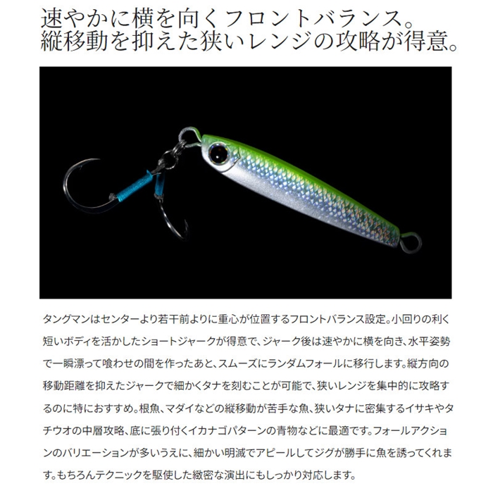 高比重タングステン素材の特性を活かし、ややフロントバランスの薄型フラットサイドボディを採用した「タングマン」。強い明滅を伴いランダムにアクションを変化させるすばやい水平バイブレーションフォールと、速やかに横を向く軽やかなジャークアクションが特徴。癖がなく扱いやすいので、パイロットルアーとしておすすめです。タングマンH 40g/50gには初めからTYPE-LJアシストSSサイズが付属。パッケージから出してすぐにご使用いただけます。[24new16][24sawaracasting]
