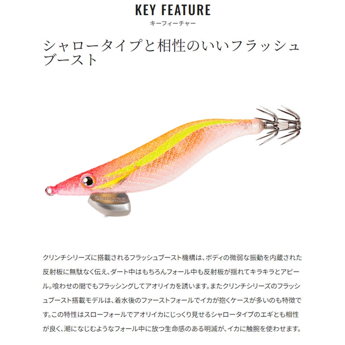 クリンチシリーズが持つ高い動力性能、すなわちキレの良いダートアクションはそのままに、ボディ内部にフラッシュブースト機構を搭載。ダートアクション中はもちろん、フリーフォールやテンションフォール中にも反射板が明滅し、アオリイカを誘います。エギローテーションに組み込むことで、攻略の幅が更に広がります。[Sephia Clinch]