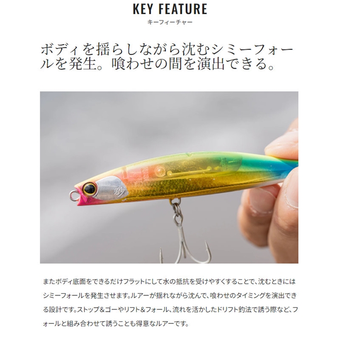 飛距離とアクションに優れたビームドリフトシリーズに、新しく97mmの小型サイズが登場。オリジナルの単なるダウンサイズモデルではなく、空気室の大きさやウェイトのバランスを細かく突き詰めたことで、キャスト後の飛行姿勢やアクション時の姿勢が安定するようベストなバランスに設計されています。さらにルアーが小さくなり空気抵抗をより受けにくくなったことから、キャストフィールがこれまで以上に爽快に。遠投による沖のポイントへのアプローチはもちろん、アングラーの多いハイプレッシャーなエリアでも、高い喰わせ性能を発揮してくれるシンキングペンシルです。[24new16]