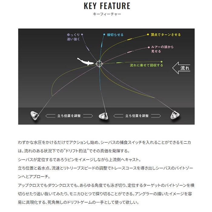 クスセンスから新たにシャローランナーが登場。このルアーに求めたのは、水面直下から30cmのシャローレンジを攻略すること。そこで必要なのがレスポンスの良さとキレのあるウォブンロールアクション。アップに投じてクロスに転じた刹那のアクション変化をも設計に落とし込んだ。特筆すべきは平均60mを超える飛距離。これは干潟や水深の浅い河川などの広大なシャローエリアにも焦点を当て、レスポンス良く広くターゲットを探れる仕様にしてある。河川の流れを利用したドリフト釣法も難なくこなす。名前の由来にもなった、モニカの水面炸裂ハーモニカバイトをお愉しみください。[24new16]