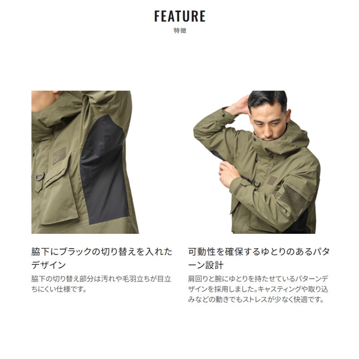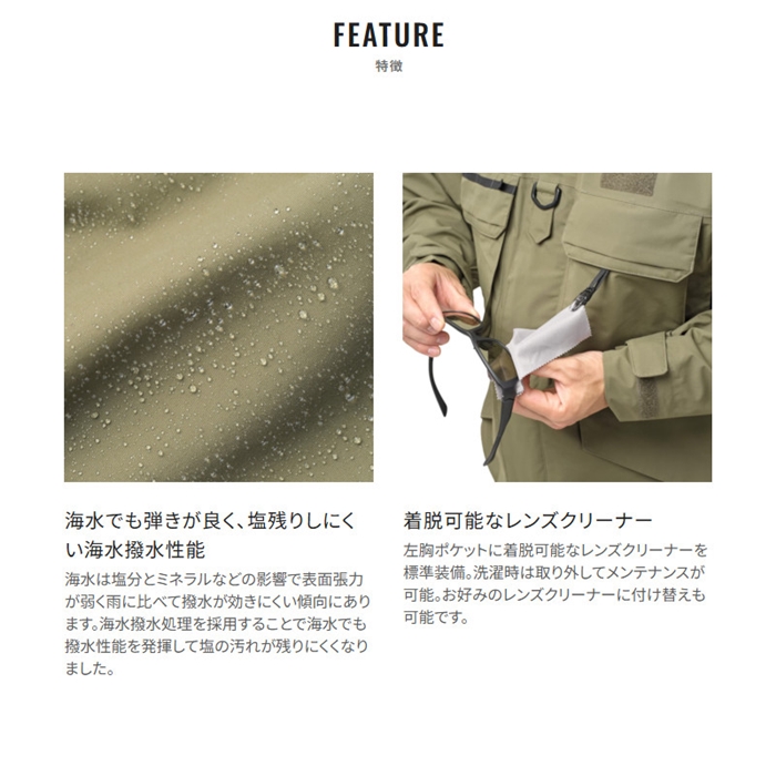 シマノが提案する、1枚でスタイルが決まるレインジャケットです。ES「Enough storage(イナフストレージ)」の名が表すように、釣りに必要なアイテムを収納するためのポケットやループ、Dカンがデザインに落とし込まれています。厳しい防水透湿基準をクリアしたドライシールド+生地に海水でも弾きがよく塩残りしにくい「海水撥水」の新機能を搭載し、フィッシングギアとしての性能を一つ上に押し上げました。スタイリッシュなデザインに釣具メーカーのプライドを融合させた自信作です。[25new04]