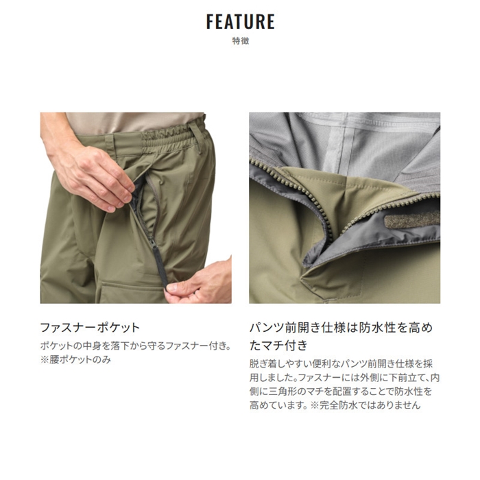 シマノが提案する、秀逸な機能性のレインパンツです。ES「Enough storage(イナフストレージ)」の名が表すように、釣りに必要なアイテムを収納するためのポケットやループ、Dカンがデザインに落とし込まれています。厳しい防水透湿基準をクリアしたドライシールド+生地に海水でも弾きがよく塩残りしにくい「海水撥水」の新機能を搭載し、フィッシングギアとしての性能を一つ上に押し上げました。スタイリッシュなデザインに釣具メーカーのプライドを融合させた自信作です。[25new04]