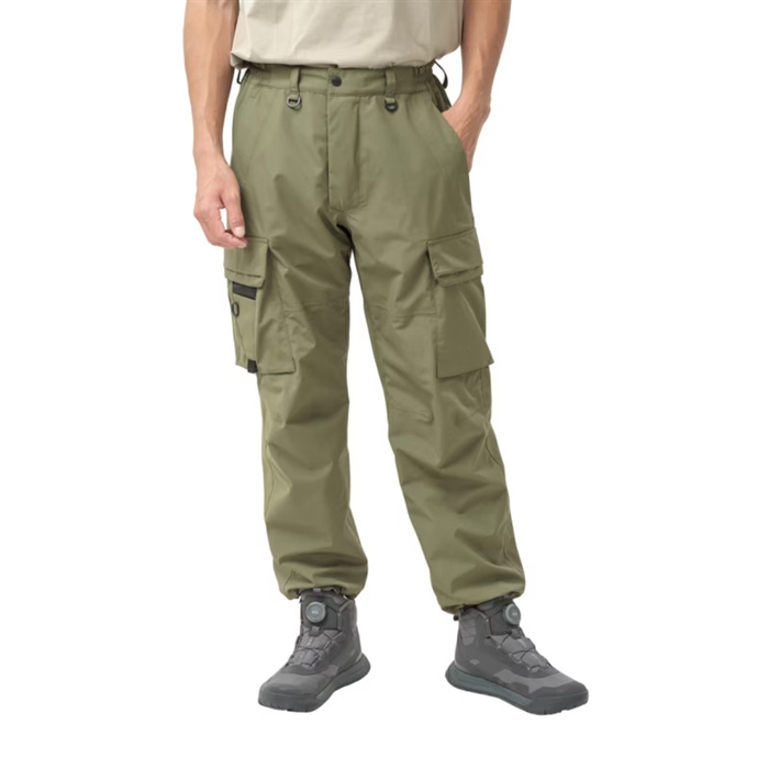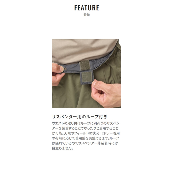 シマノが提案する、秀逸な機能性のレインパンツです。ES「Enough storage(イナフストレージ)」の名が表すように、釣りに必要なアイテムを収納するためのポケットやループ、Dカンがデザインに落とし込まれています。厳しい防水透湿基準をクリアしたドライシールド+生地に海水でも弾きがよく塩残りしにくい「海水撥水」の新機能を搭載し、フィッシングギアとしての性能を一つ上に押し上げました。スタイリッシュなデザインに釣具メーカーのプライドを融合させた自信作です。[25new04]